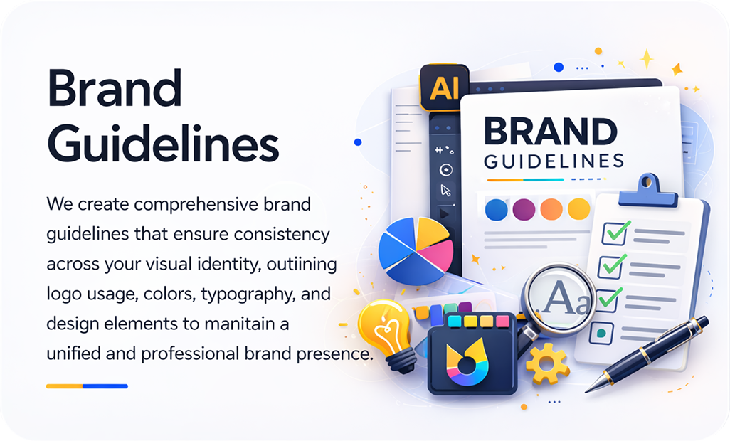 We build a complete brand identity system including typography, color palettes, visual guidelines, tone of voice, and logo usage rules to ensure consistency across all platforms.